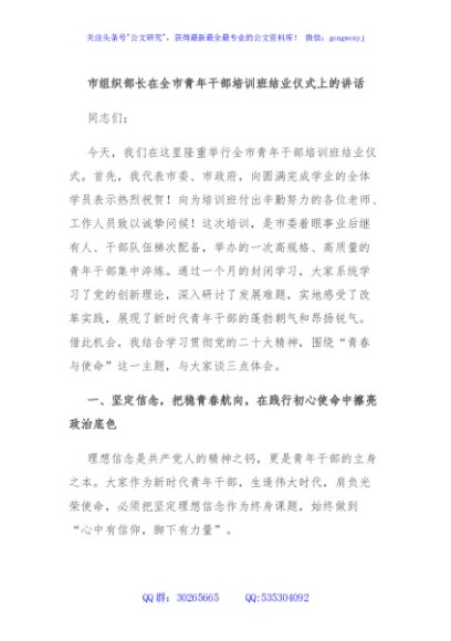 / 市组织部长在全市青年干部培训班结业仪式上的讲话