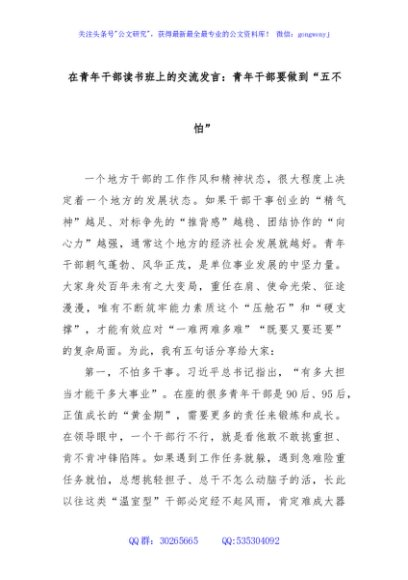 / 在青年干部读书班上的交流发言:青年干部要做到“五不怕”
