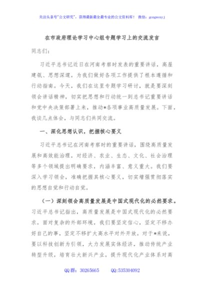 / 在市政府理论学习中心组专题学习上的交流发言