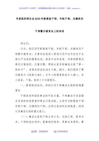 / 市委组织部长在2025年新提拔干部、年轻干部、关键岗位干部警示教育会上的讲话