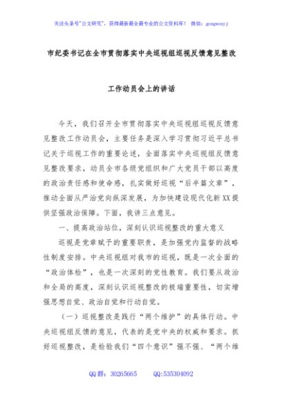 / 市纪委书记在全市贯彻落实中央巡视组巡视反馈意见整改工作动员会上的讲话