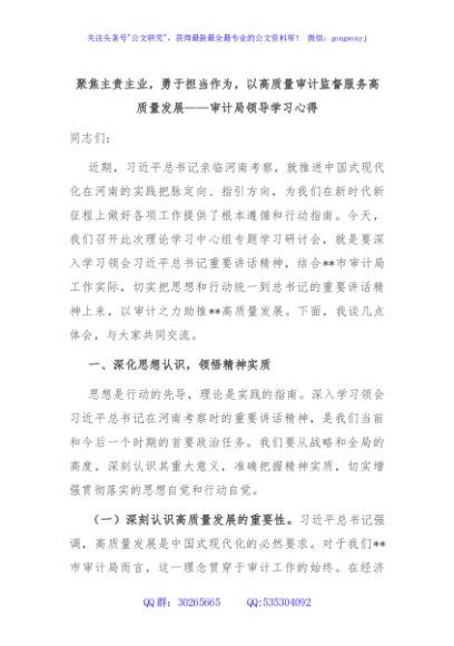 / 聚焦主责主业,勇于担当作为,以高质量审计监督服务高质量发展——审计局领导学习心得