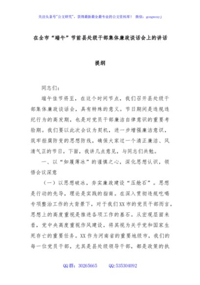 / 在全市“端午”节前县处级干部集体廉政谈话会上的讲话提纲