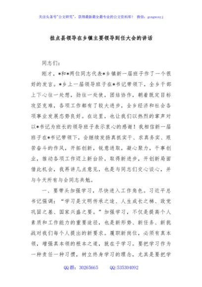 / 挂点县领导在乡镇主要领导到任大会的讲话