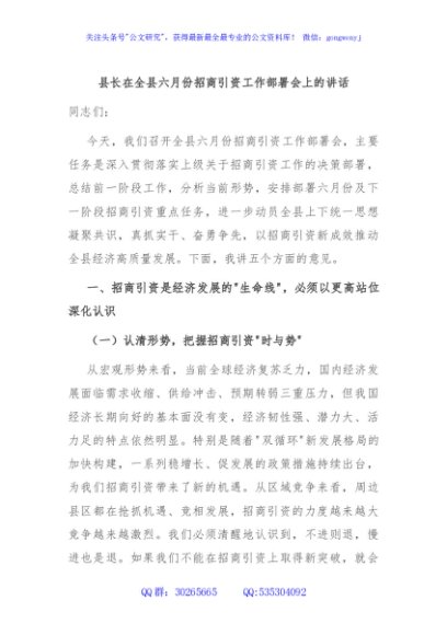 / 县长在全县六月份招商引资工作部署会上的讲话