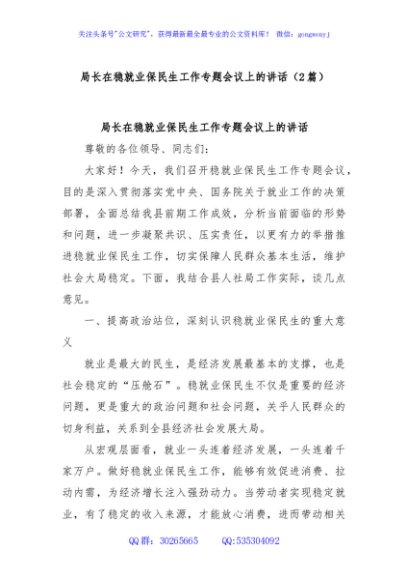 (2篇)局长在稳就业保民生工作专题会议上的讲话