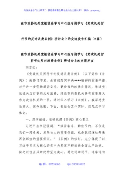 / (2篇)在市政协机关党组理论学习中心组专题学习《党政机关厉行节约反对浪费条例》研讨会上的交流发言汇编