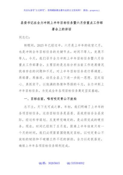 / 县委书记在全力冲刺上半年目标任务暨六月份重点工作部署会上的讲话