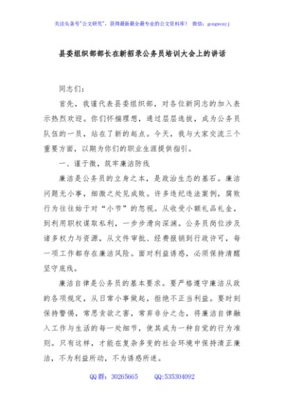 / 县委组织部部长在新招录公务员培训大会上的讲话