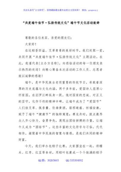 / “共度端午佳节·弘扬传统文化”端午节文化活动致辞