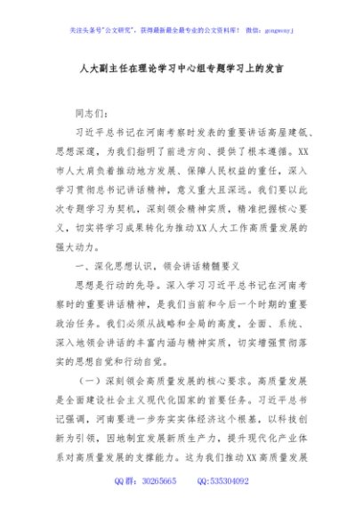 / 人大副主任在理论学习中心组专题学习上的发言
