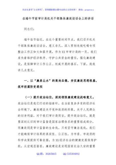 / 在端午节前审计局机关干部集体廉政谈话会上的讲话