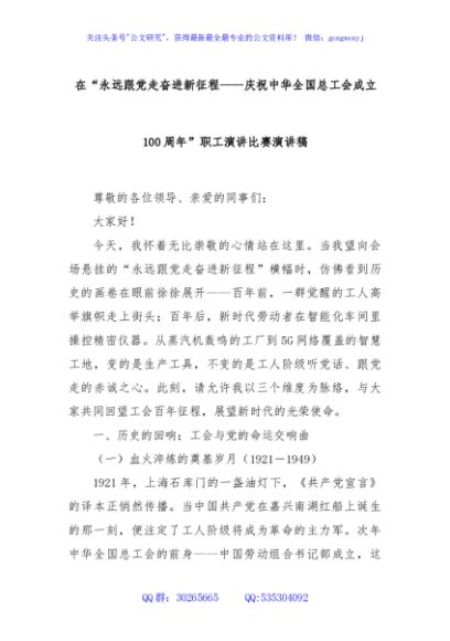 / 在“永远跟党走奋进新征程——庆祝中华全国总工会成立100周年”职工演讲比赛演讲稿