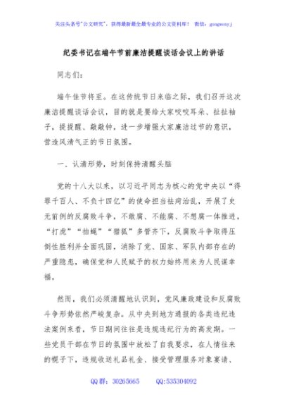 / 纪委书记在端午节前廉洁提醒谈话会议上的讲话