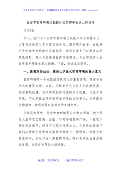 / 在全市营商环境优化提升动员部署会议上的讲话