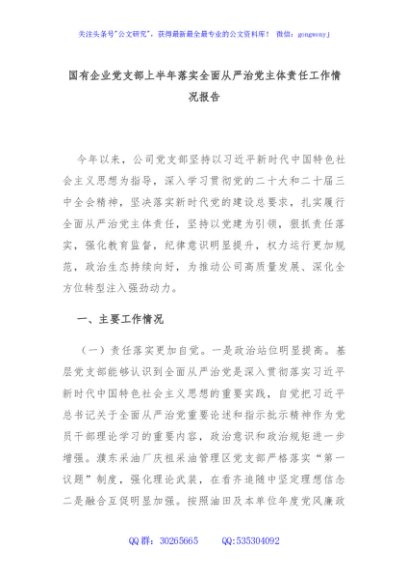 / 国有企业党支部上半年落实全面从严治党主体责任工作情况报告