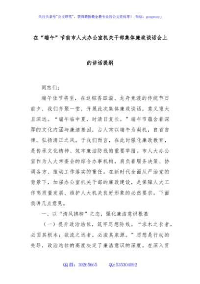 / 在“端午”节前市人大办公室机关干部集体廉政谈话会上的讲话提纲
