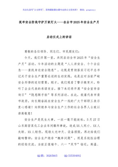/ 筑牢安全防线守护万家灯火——在全市2025年安全生产月启动仪式上的讲话