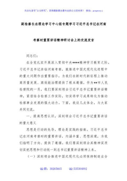/ 副检察长在理论学习中心组专题学习总书记在河南考察时重要讲话精神研讨会上的交流发言