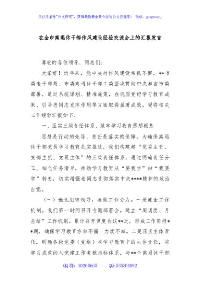 / 在全市离退休干部作风建设经验交流会上的汇报发言