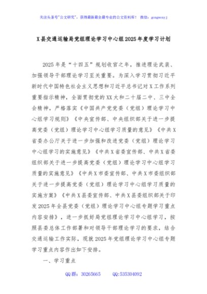 / X县交通运输局党组理论学习中心组2025年度学习计划