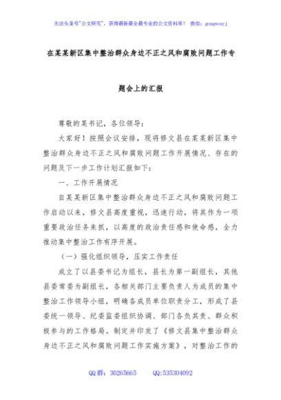 / 在某某新区集中整治群众身边不正之风和腐败问题工作专题会上的汇报