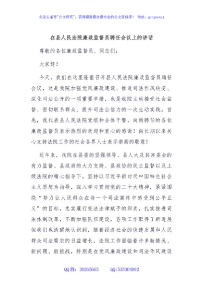 / 在县人民法院廉政监督员聘任会议上的讲话