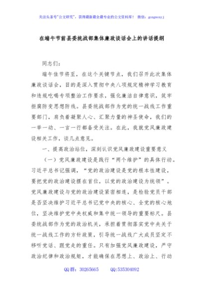 / 在端午节前县委统战部集体廉政谈话会上的讲话提纲