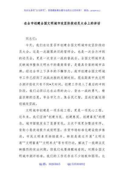 / 在全市创建全国文明城市攻坚阶段动员大会上的讲话