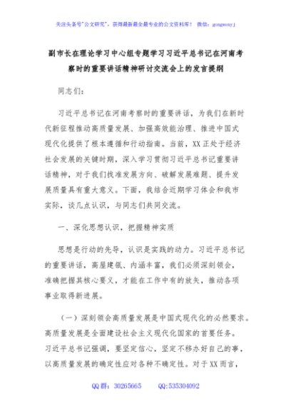 / 副市长在理论学习中心组专题学习习近平总书记在河南考察时的重要讲话精神研讨交流会上的发言提纲