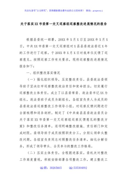 / 关于落实XX市委第一交叉巡察组巡察整改进展情况的报告