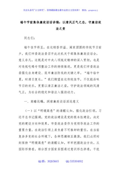 / 端午节前集体廉政谈话讲稿:以清风正气之态,守廉洁政法之责