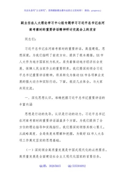 / 副主任在人大理论学习中心组专题学习习近平总书记在河南考察时的重要讲话精神研讨交流会上的发言