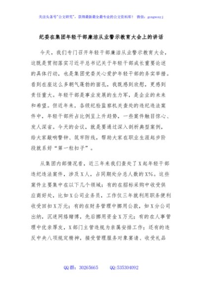 / 纪委在集团年轻干部廉洁从业警示教育大会上的讲话