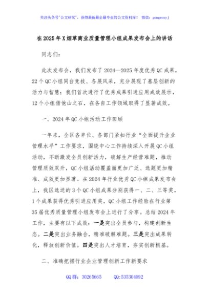 / 在2025年X烟草商业质量管理小组成果发布会上的讲话