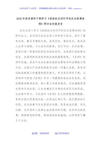 / 2025年党员领导干部学习《党政机关厉行节约反对浪费条例》研讨会交流发言