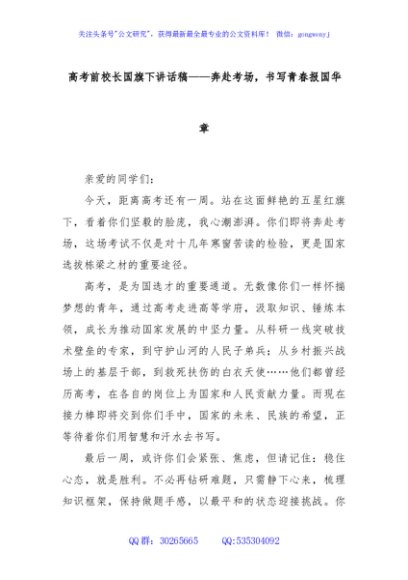 / 高考前校长国旗下讲话稿——奔赴考场,书写青春报国华章