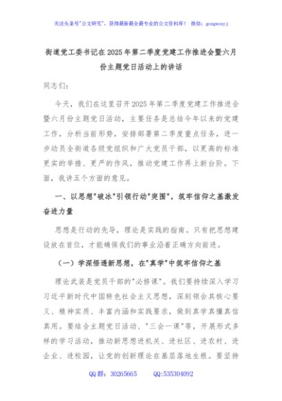 / 街道党工委书记在2025年第二季度党建工作推进会暨六月份主题党日活动上的讲话