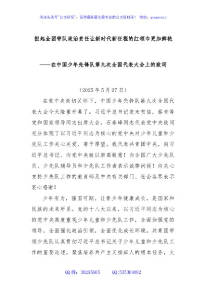 / 担起全团带队政治责任让新时代新征程的红领巾更加鲜艳——在中国少年先锋队第九次全国代表大会上的致词