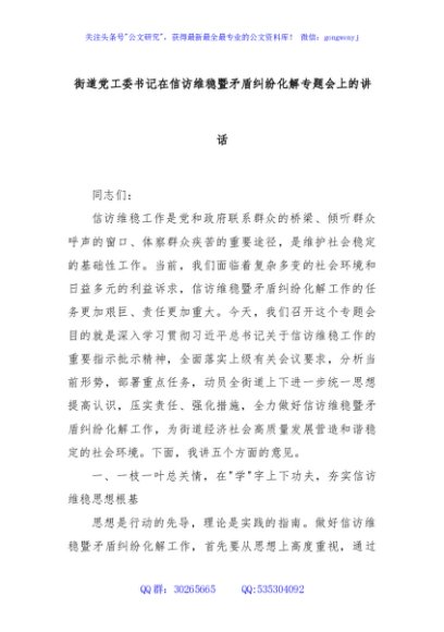 / 街道党工委书记在信访维稳暨矛盾纠纷化解专题会上的讲话
