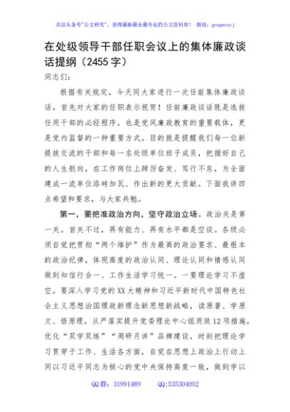 / 在处级领导干部任职会议上的集体廉政谈话提纲
