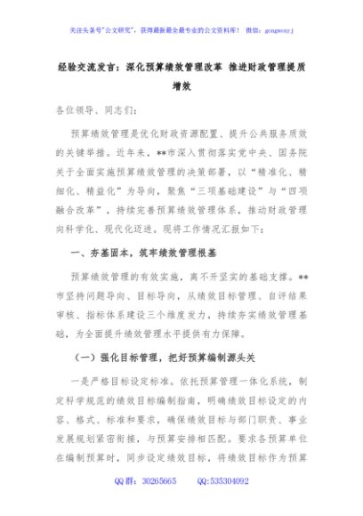 / 经验交流发言:深化预算绩效管理改革 推进财政管理提质增效