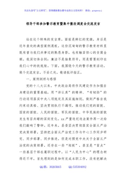 / 领导干部参加警示教育暨集中整改调度会交流发言