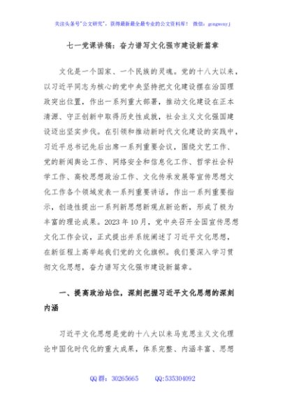 / 七一党课讲稿:奋力谱写文化强市建设新篇章