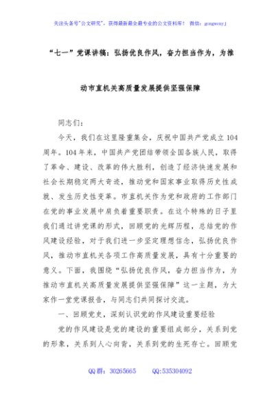 / “七一”党课讲稿:弘扬优良作风,奋力担当作为,为推动市直机关高质量发展提供坚强保障