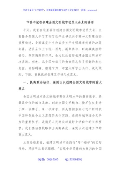 / 市委书记在创建全国文明城市动员大会上的讲话