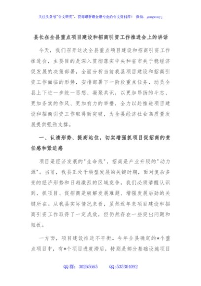 / 县长在全县重点项目建设和招商引资工作推进会上的讲话