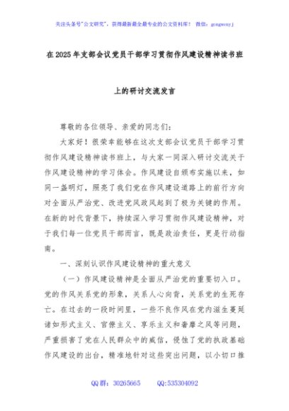 / 在2025年支部会议党员干部学习贯彻作风建设精神读书班上的研讨交流发言