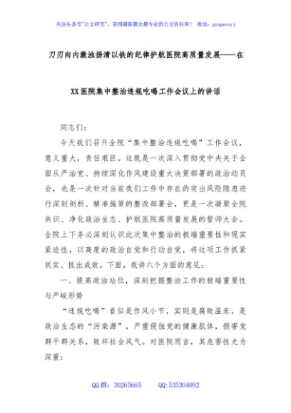/ 刀刃向内激浊扬清以铁的纪律护航医院高质量发展——在XX医院集中整治违规吃喝工作会议上的讲话