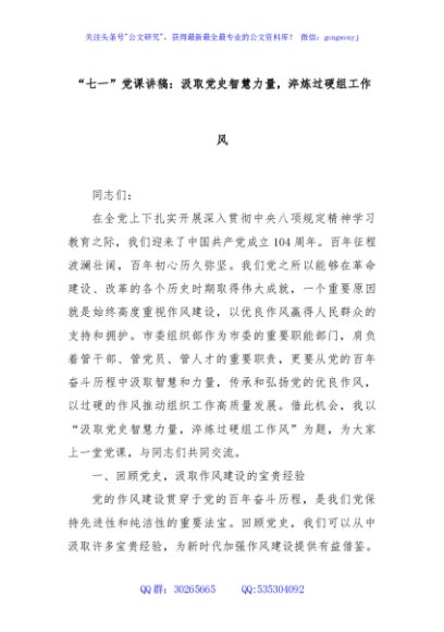 / “七一”党课讲稿:汲取党史智慧力量,淬炼过硬组工作风